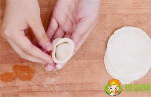 3、取一個面皮,放入適量的餡料,對折成半圓形,捏緊邊緣。
