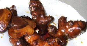 3、煮洋姜:將浸泡好的洋姜放入鍋中,加入適量的清水,大火煮沸后轉小火慢燉,煮至熟透后撈出。