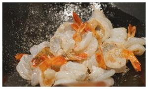 (4)加入蝦仁快速翻炒至變色。
